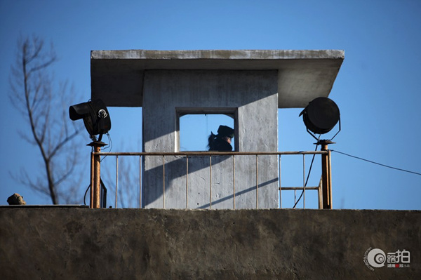 2月3日,夜幕之中,朝鲜新义州零星灯火,火车站照射金正日画像的灯光在远处形成一道光柱。