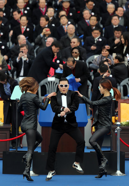 当地时间2013年2月25日,韩国首尔,国会议事堂广场举行文艺表演,为总统就职典礼预热,2012年因《江南Style》红遍全球的鸟叔PSY现身表演。