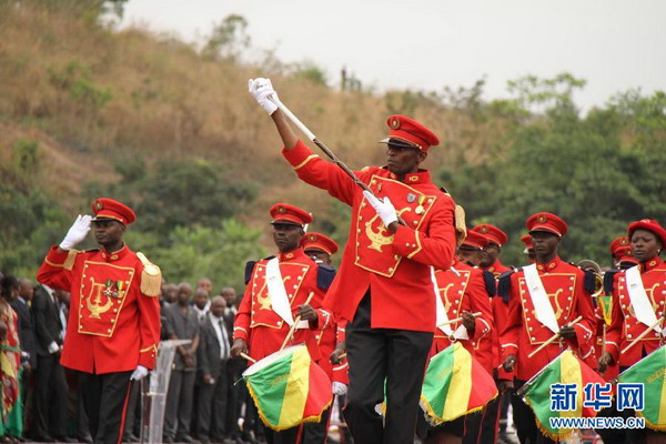 8月15日,在刚果(布)普尔省省会金卡拉,仪仗队在阅兵式上行进。